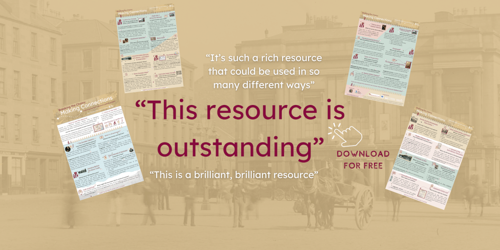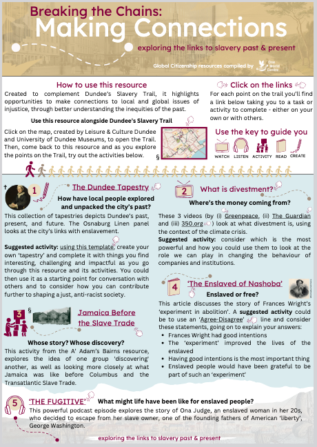 The Breaking the Chains – Making Connections project was a real honour to work on. Using Leisure and Culture Dundee’s Slavery Trail as a starting point, I was tasked by the One World Centre with creating a resource that coud be used by community groups and individuals, to help them explore the city’s past and its connection to the Transatlantic Slave Trade. Key to this was making it relevant to today, highlighting connections to issues of injustice and inequality, past and present.